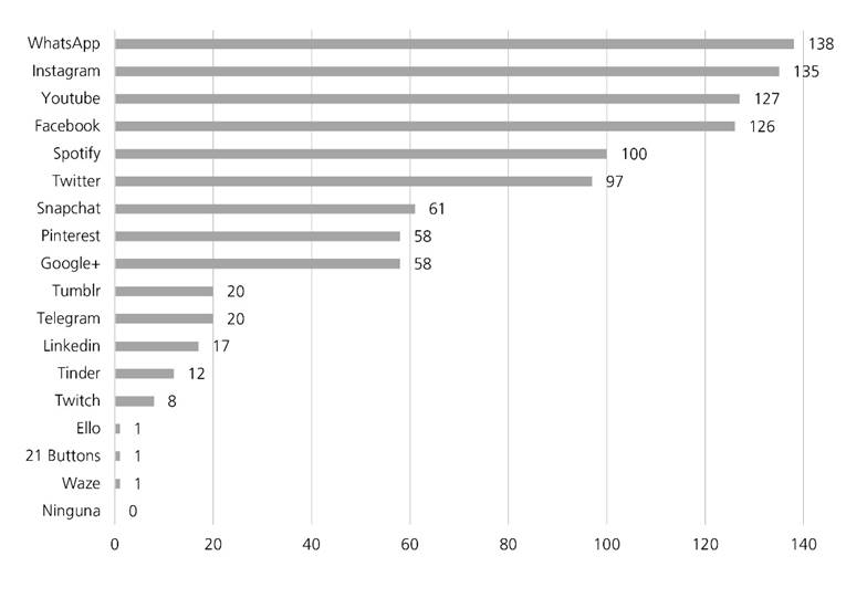 En la Figura 5 se observa que todos los estudiantes utilizan redes sociales, y que ninguna pertenece a las denominadas como educativas. Entre las identificadas, las de mayor implantación son, por orden: WhatsApp, Instagram, Youtube, Facebook, Spotify y Twitter. Las dos primeras alcanzan casi al 100% de los encuestados, y las restantes se sitúan entre el 70 y 90%. Las demás redes sociales no llegan al 50% y destacan Ello, 21 Buttons y Waze utilizadas por un único alumno, distinto en cada caso.
