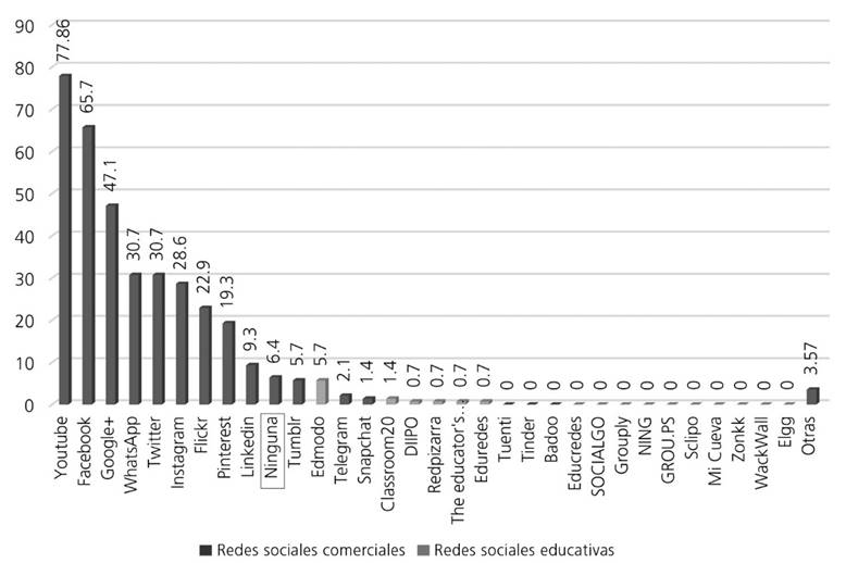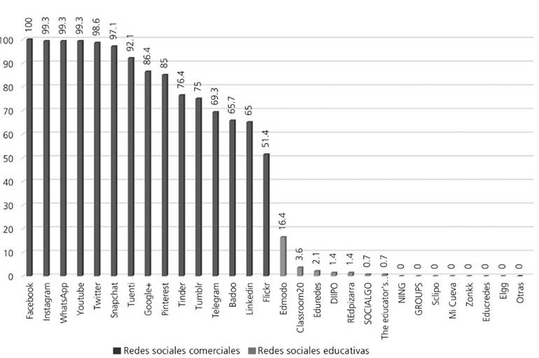 En mayor o menor medida, todas las redes sociales categorizadas como comerciales son conocidas. Destaca Facebook seleccionada por el 100% de los estudiantes, si bien no es la más usada, tal y como se ha observado en los resultados anteriores (Figura 5). Instagram, WhatsApp y Youtube son conocidas por el 99.3%. Le siguen Twitter y Snapchat, también con porcentajes superiores al 95%. Por debajo de esta cifra, aunque en la franja del 90%, se sitúa Tuenti. Google + y Pinterest descienden al 85% aproximadamente. Las últimas redes sociales con un grado de conocimiento por encima del 50% son Tinder, Tumblr, Telegram Messenger, Badoo, Linkedin y Flickr. Respecto de las redes sociales educativas, estas son conocidas por menos del 20%. Edmodo es la que obtiene el mejor resultado (16.4%) y hay 9 que no han sido reconocidas por ningún estudiante. Consecuentemente con el hecho de que todo el alumnado usa alguna o algunas redes sociales (Figura 5), nadie afirma no conocer ninguna red social.