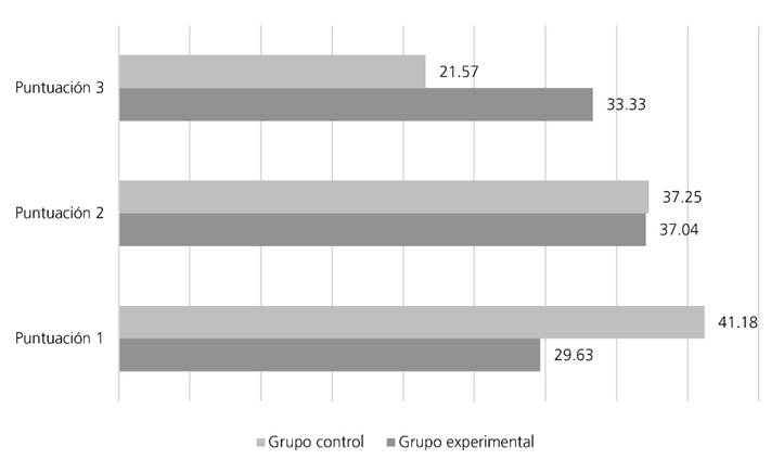 En el grupo experimental, la gran mayoría (70.37%) considera que la práctica docente realizada ha mejorado su alfabetización en TIC (puntuaciones 2 y 3), mientras que solo un 29.63% piensa lo contrario (puntuación 1), siendo este el menor porcentaje de las tres posibles puntuaciones. Por el contrario, en el grupo de control, es esta puntuación (1) la mayoritaria (41.18%). Pese a ello, también en este grupo el número de estudiantes que considera que la realización de la práctica docente ha mejorado su conocimiento de las competencias digitales es superior (58.82%) al del que considera lo contrario (41.18%). De forma específica, un 37.25% afirma haber adquirido y/o mejorado en cierta medida sus competencias digitales (puntuación 2) y un 21.57% haberlo hecho totalmente (puntuación 3). En ambos casos, los porcentajes son inferiores a los del grupo experimental, máxime en el de la puntuación 3, donde la variación intergrupo es del 11.76% (7 estudiantes), mientras que para la puntuación 2, la diferencia es del 0.22% (un solo estudiante).