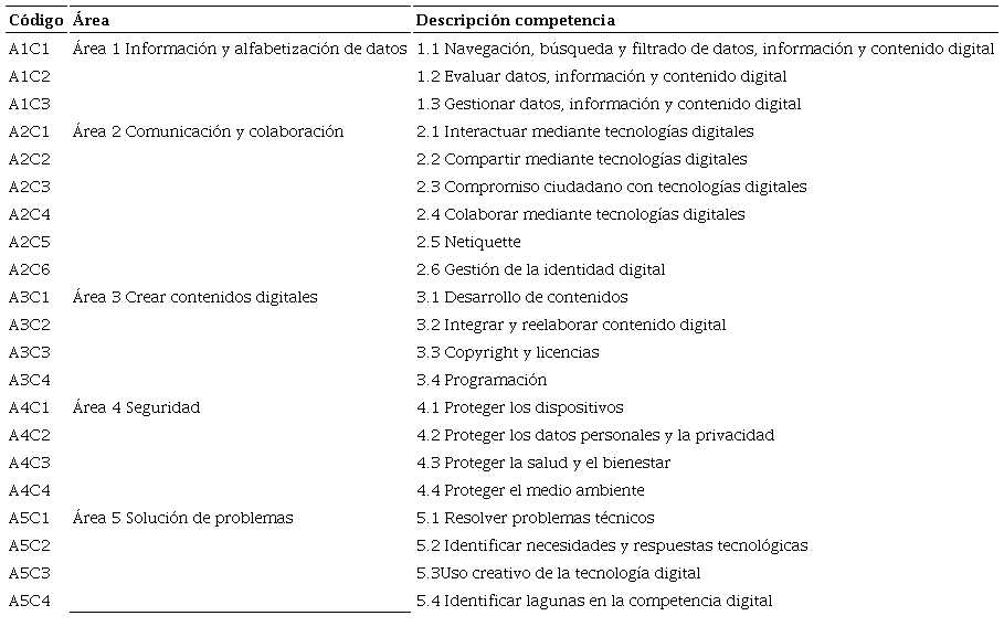 Tal y como se puede observar en la Tabla 1, las competencias digitales no son una habilidad aislada a desarrollar, sino que suponen un compendio de destrezas, habilidades y actitudes ante diferentes áreas y dimensiones del conocimiento (Rodríguez-García, Raso-Sánchez y Ruiz-Palmero, 2019) con las que deben contar todos los ciudadanos. Es, precisamente, respecto de su adquisición que las instituciones de educación superior adquieren un papel clave en función de su objetivo principal, que es la formación y capacitación de los jóvenes para que puedan afrontar un presente y un futuro en el que las TIC han revolucionado las formas de comunicarse, aprender, acceder al trabajo, etc. (Vázquez-Cano, López Meneses y Jaén Martínez, 2017). En este sentido, y centrándose en el área específica de la educación superior, Ramírez-Martinell y Casillas (2014) plantean 10 saberes digitales necesarios que organizan en cuatro rubros: manejo de sistemas digitales; manipulación de contenido; comunicación y socialización en entornos digitales; y manejo de información.