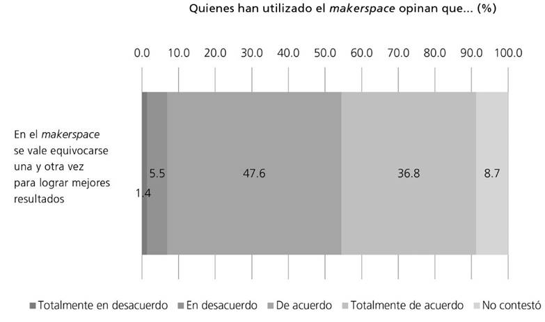 Quienes han hecho uso del lugar lo valoran, ya que el 84.4% manifiesta que es un lugar en donde se vale equivocarse una y otra vez para lograr mejores resultados (Figura 1). De igual manera, el 72% de los usuarios del laboratorio coincide en que dicho espacio es parte fundamental y razón de ser del makerspace, y que es esencial en la elaboración de prototipos para la consolidación de proyectos de innovación, además que será de utilidad para su vida laboral debido a la experiencia adquirida por el uso de los equipos; en este mismo sentido, destacan las características de este makerspace, tales como la facilidad de acceso al equipo y materiales, costos más económicos, o incluso gratuitos, para el uso de los equipos y el hecho de aprender haciendo. Otros puntos de conformidad son la cantidad suficiente de equipos y el estado óptimo de los mismos.