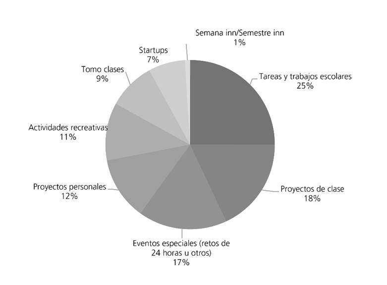 De acuerdo con la encuesta, las tres formas más frecuentes de uso declaradas para el makerspace son: 25% para realizar tareas y trabajos escolares, 18% para llevar a cabo proyectos de clase y 17% para acudir a eventos especiales (Figura 2).