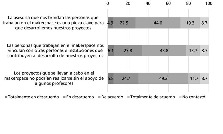 En esta misma línea, los usuarios estiman de manera positiva el conjunto de ayudas, orientaciones e información recibidas, ya que el 60.8% de los encuestados concuerda en que tanto la asesoría como la vinculación con otras personas e instituciones que les brindan los profesores y demás personas que laboran en el makerspace son pieza clave para el desarrollo y consolidación de sus proyectos (Figura 3).