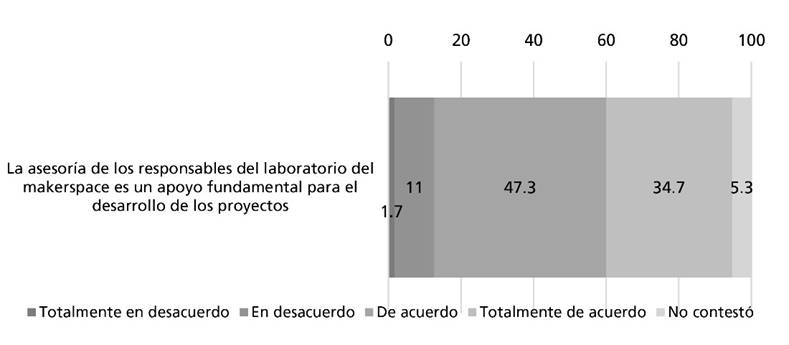 De manera particular, el 82 % de quienes han hecho uso del laboratorio del makerspace consideran que la asesoría de los responsables de este espacio es un apoyo fundamental para el desarrollo de los proyectos (Figura 4).