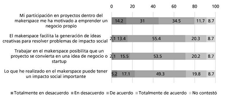 Por otra parte, en lo que se refiere al impacto del makerspace en la formación académica, sin duda ha sido predominantemente positivo, pues además de los beneficios identificados por los estudiantes entrevistados, el 70.7% de los usuarios encuestados considera que les ha ayudado a aplicar el conocimiento, a trabajar de manera colaborativa y creativa en la solución de problemas, a ejercitar posiciones de liderazgo y a desarrollar una mirada profesional. Similarmente, el 66.2% considera que el makerspace les ayuda a iniciar una unidad de negocio o startup (Figura 5).