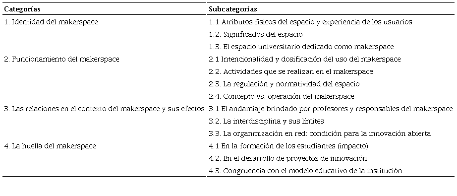 El material discursivo obtenido mediante entrevistas semiestructuradas y grupos de enfoque realizados con alumnos, exalumnos y profesores usuarios frecuentes del makerspace universitario, así como con las responsables actuales del espacio y algunos de sus fundadores, fue trabajado secuencialmente a través de diferentes fases. En primer lugar, las audiograbaciones y videograbaciones fueron transcritas literalmente (verbatim) y convertidas en texto. Posteriormente, cada texto fue sometido a una lectura detallada y colegiada que permitió codificarlo a partir de la identificación de temas y subtemas relevantes en función de las preguntas de investigación. Finalmente, esos temas y subtemas fueron convertidos en categorías y subcategorías significativas que, si bien se presentan de manera separada con fines analíticos, todas se encuentran articuladas y dan cuenta de cómo se concibe al makerspace universitario, lo que se produce en su interior y su impacto en distintos niveles de la práctica educativa y el desarrollo de proyectos de innovación; todo ello, desde la perspectiva de sus usuarios y de quienes atienden de distintas formas este espacio.