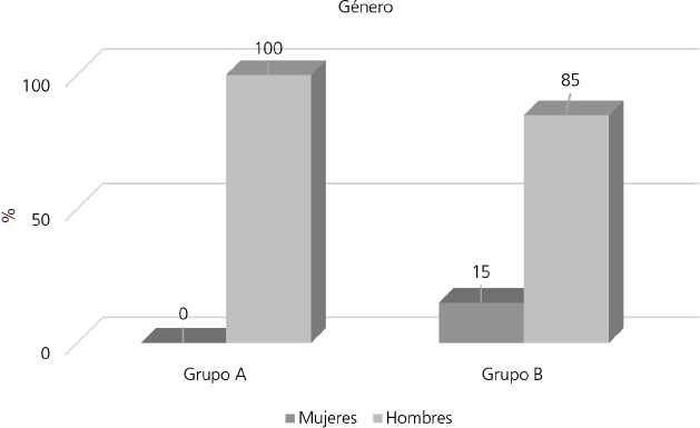 La muestra la conformaron 34 estudiantes en un rango de edad entre 17 y 21 años, para formar dos grupos de control para medir el aprendizaje: el A, constituido por 14 hombres, de los programas de Ingeniería de sistemas, Electrónica, Industrial, Mecánica y transferencias, y el grupo B, conformado por 17 hombres y 3 mujeres del programa de Ingeniería de sistemas, de manera que, por género, los hombres tuvieron la mayor participación en ambos grupos (Figura 1).