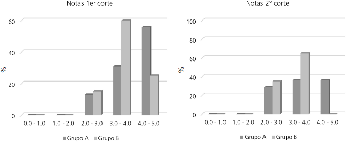 La tendencia de notas altas siempre se evidenció en el grupo A ya que, en el primer corte, 56% obtuvo notas mayores a 4.0 y 31% un poco mayores a 3.0. En el segundo corte, 29% perdió y 72% aprobó (36% con notas entre 3.0 y 4.0 y el otro 36% con mayores a 4.0). Mientras 60% del grupo B pasó el primer corte con notas entre 3.0 a 4.0, 25% entre 4.0 y 5.0 y solo 15% perdió con notas mayores o iguales a 2.0; para el segundo corte, 65% de alumnos aprobó con notas entre 3.0 y 4.0 y el 35%, con mayores a 2.0 (Figura 10).
