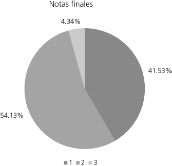 Asimismo, se realizó una confrontación con las notas finales de estos mismos estudiantes y se obtuvo el siguiente resultado (Figura 11): a) 41.53% aprobó la materia con una nota superior o igual a 3.0 y menor a 4.0; b) 54.13% obtuvo una nota superior o igual a 4.0; y c) 4.34% reprobó la asignatura (Figura 11).