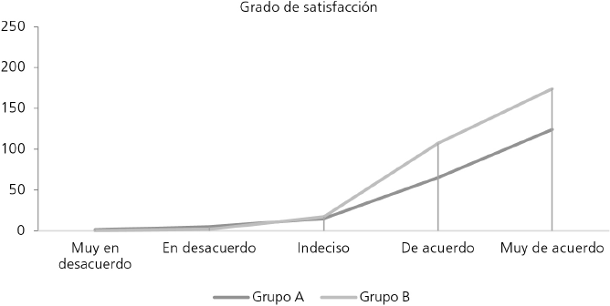 Primero, se analizó el grado de satisfacción de aprendizaje. La Tabla 2 muestra el total de respuestas dadas por los estudiantes en cada ítem de la encuesta, donde las opciones “de acuerdo” y “muy de acuerdo” fueron las más seleccionadas; resultando significativas para la correlación de Pearson de los grupos A y B del grado total de satisfacción, ya que el coeficiente es de 99%, lo que significa que es positivo, muy alto y casi perfecto; la Figura 2 muestra el crecimiento de satisfacción en ambos sobre los recursos digitales de tecnologías emergentes a lo largo de 2019.