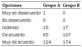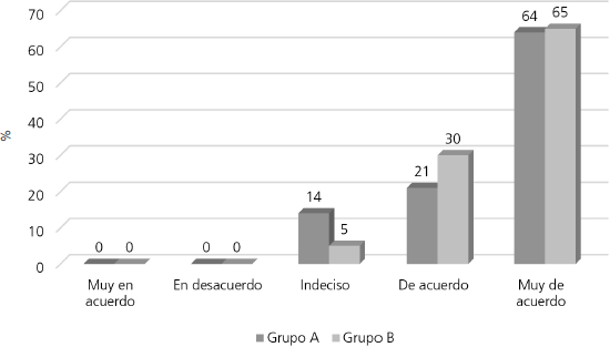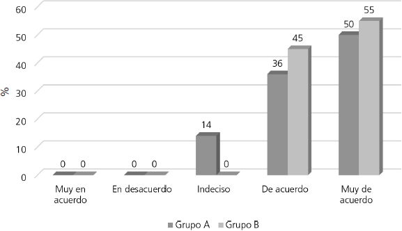 5)La metodología del curso promueve el autoestudio a través de los recursos tecnológicos: la mitad del grupo A indicó estar “muy de acuerdo”, 36% “de acuerdo” y 14% “indecisos”, mientras en el grupo B, 55% respondió estar “muy de acuerdo” y 45% “de acuerdo”. Examinando estas cifras podemos ver que los rangos de más valor están entre un alto grado de satisfacción (Figura 3).