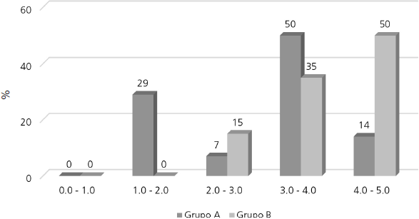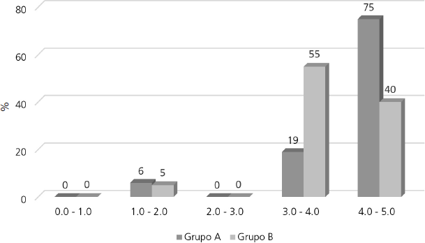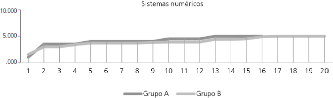 Para el tema Sistemas numéricos, las notas promedio del grupo A fueron de 4.06, y para el B de 3.97 (Figura 5), mostrando una diferencia de 0.09 poco significativa, donde la relación entre los grupos es muy cercana, como lo muestra la Figura 6, ya que los rangos de notas para el A estuvo en 75% entre 4.0 a 5.0, mientras que para el B, más de la mitad estuvo entre el rango de 3.0 a 4.0 y la otra parte en el rango alto.