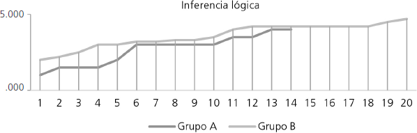 Para el tema inferencia lógica, las notas promedio para los grupos A y B fueron de 2.68 y 3.59, respectivamente, con una diferencia alta (0.91), debido a que al grupo B se le facilitaron e implementaron más recursos digitales de tecnología emergente, mientras el grupo A tuvo menos herramientas (Figura 7).