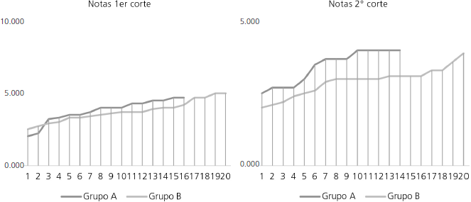 Con respecto a las notas que se tuvieron en los primeros cortes se puede decir que siempre hubo una relación cercana entre los grupos, ya que el promedio del primer corte para el grupo A fue de 3.79 y para el B de 3.72, con una diferencia demasiado pequeña (0.07), mientras que en el segundo corte el promedio fue de 3.46 y 2.92, con una diferencia media de 0.55 (Figura 9).