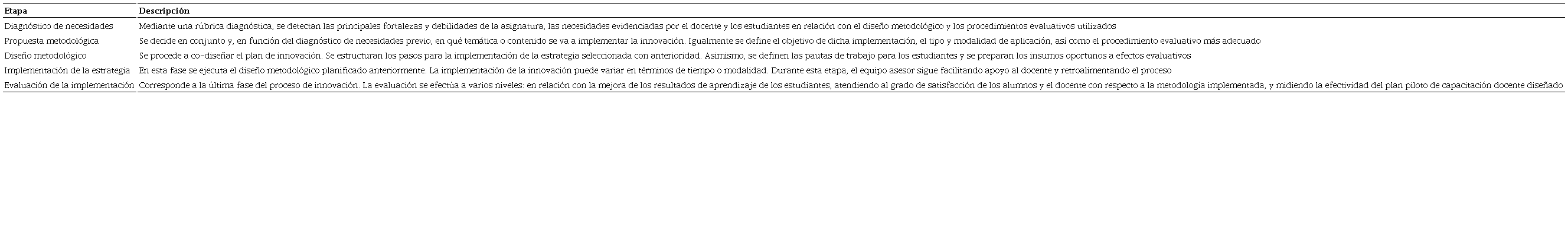En la Tabla 1 se muestran las distintas etapas del proceso de innovación docente, que fueron integradas a las actividades del proyecto: