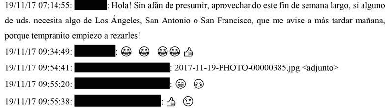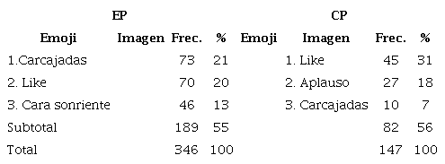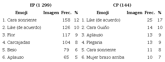 Las emojiconversaciones (presentes en 57% de los segmentos de la EP y en 44% del CP) son textos que algunos chatistas elaboran con emojis (Figura 1) para comunicar estados de ánimo alegres y para señalar agrado o acuerdo (Tabla 8).
