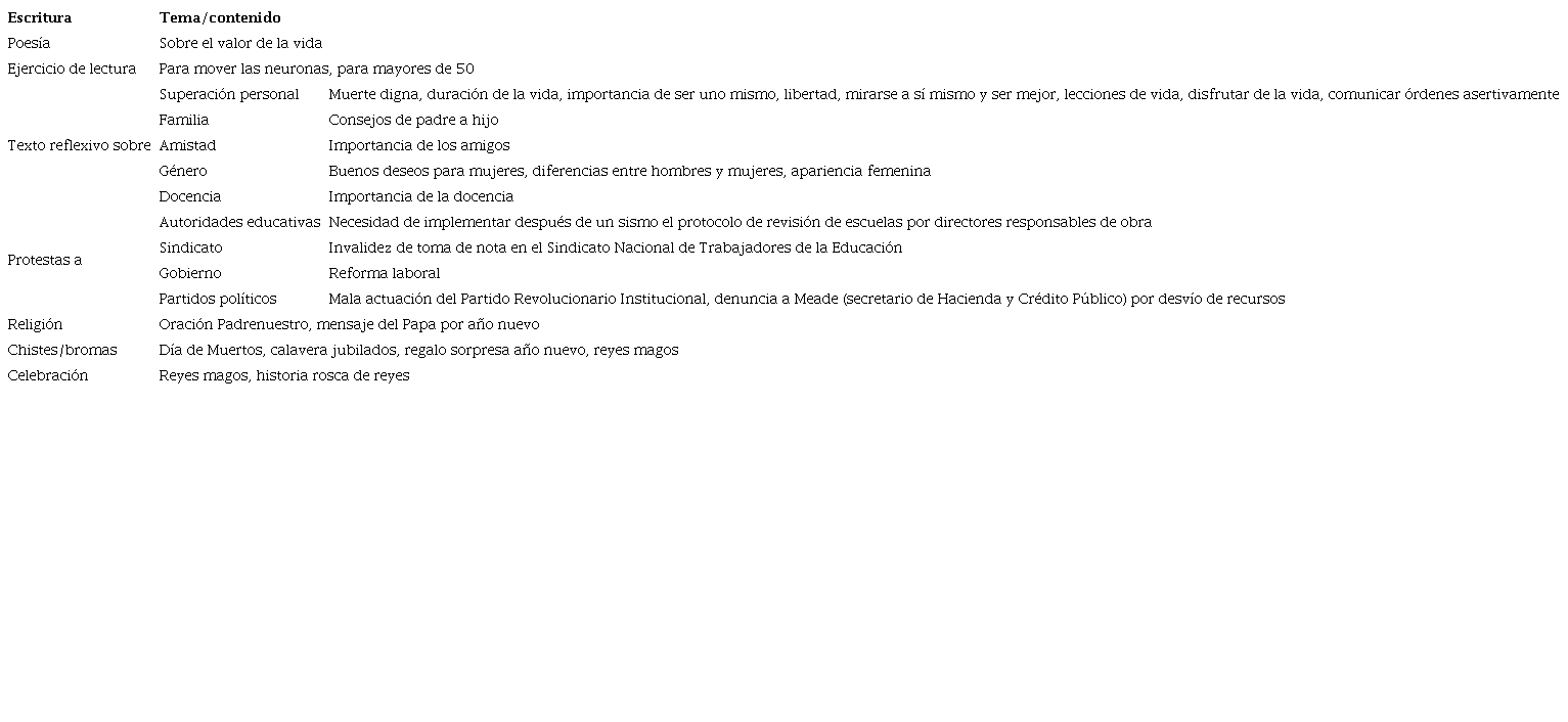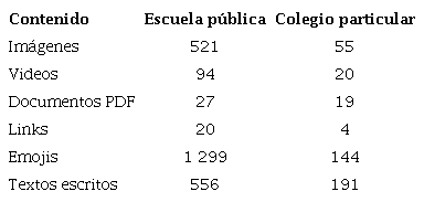 Adicionalmente, en 22% de los segmentos del chat de la EP se observa “escritura sin presencia”. Difiere de la “escritura con presencia” porque alguien del grupo la recibe y la reenvía de un chat a otro o de una plataforma a otra. Sus temas son variados (Tabla 6) y pareciera que la intención de quien la postea depende de su agrado, estado de ánimo o interés por compartir algo que beneficie a los demás. La ausencia de esta escritura en el CP sugiere un uso del chat mayormente restringido a asuntos relacionados con lo escolar.