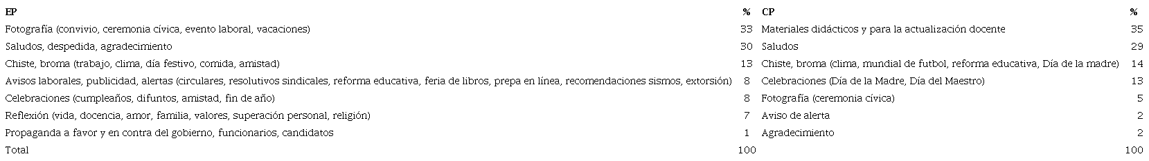 En el uso similar de las imágenes llama la atención el amplio porcentaje que en conjunto ocupan las que contienen frases reflexivas para saludar y/o para despedir el día. En las diferencias, resalta un uso alto de imágenes en la EP y uno moderado en el CP, pero concentrado en circular materiales didácticos y para la actualización (Tabla 2).15