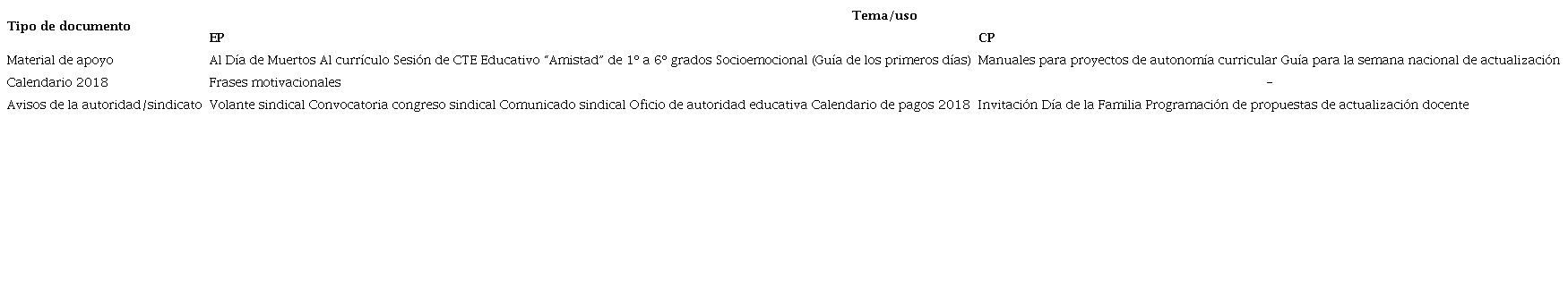 Los documentos se observan en 11% de los segmentos de la EP y en 6% de los correspondientes al CP. Sus temas y contenido sugieren que en WhatsApp circula información que antes llegaba por fax, correo electrónico o por medio de entregas personales. A diferencia de las imágenes y de los videos, todos se relacionan con la tarea educativa (Tabla 3).
