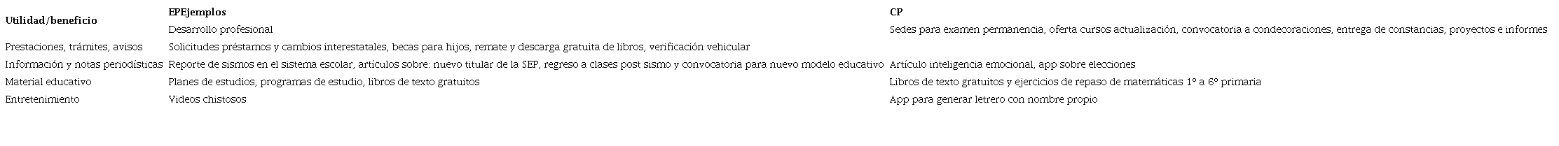Los vínculos dan acceso a documentos, a videos o a sitios alojados en internet. Su presencia en ambos chats es escasa. Se observaron en 15% de los segmentos de la EP y en 8% de los correspondientes al CP. Sin embargo, los documentos PDF son un misceláneo que “trae” al chat otras voces: la de autoridades de la Secretaría de Educación Pública (SEP), la de la organización sindical y la de periodistas que se ocupan del ámbito educativo. Asimismo, dan acceso a prestaciones y facilitan la realización de trámites. En coincidencia con lo que observan Bergviken-Rensfeldt, Hillman y Selwyn (2018), estos materiales constituyen un apoyo a los docentes porque proporcionan información y acceso a recursos que de otro modo sería difícil o imposible de obtener. En la Tabla 4 puede observarse su contenido, que señala el lugar creciente que ocupa WhatsApp como medio de comunicación de materiales de todo tipo.