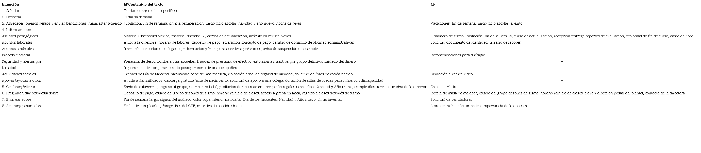 Al interior de ambos chats no se observaron conflictos o desacuerdos explícitos; sin embargo, las entrevistas y pláticas con docentes y autoridades revelan que los hay fuera de él, entre colegas o con la autoridad, y que pueden inhibir la participación. En una cara opuesta, la participación puede mantenerse, e incluso incentivarse, pese a que en el chat circulan saludos, bendiciones y “escritura sin presencia” sin relación con el propósito del grupo, porque hay confianza, respeto entre colegas y se sienten parte de un equipo de trabajo empático y con relaciones armónicas, lo cual coincide con Miller et al. (2016:98) respecto de que las relaciones sociales que se generan al interior del grupo, independientemente de lo posteado en él, son su principal contenido. Así lo manifiesta una profesora del CP: “El sentirnos parte del equipo, tenemos que consolidar un equipo, un equipo la verdad no se consolida de hoy para mañana, sino se trabaja día a día, y yo creo que el día que este equipo de trabajo se consolide, creo que va a haber mayor participación…” (ECP17, CHCP17).