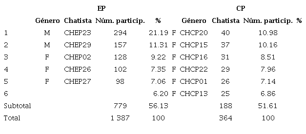 El conteo exhaustivo en los segmentos reveló que del total de participaciones (1,387), más de 50% (Tabla 9) se concentra en un número reducido de participantes, en su mayoría mujeres, aunque en la EP hay dos participantes varones que producen casi un tercio de los mensajes.