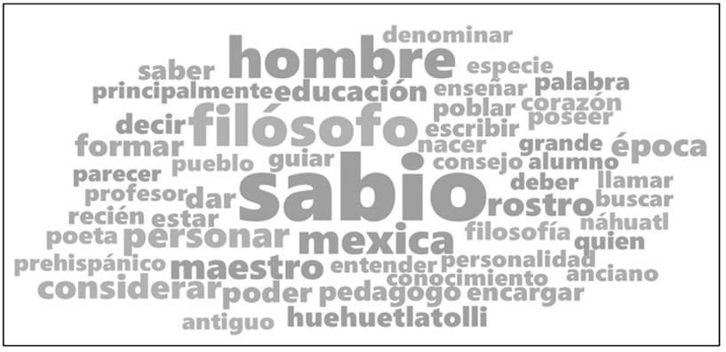 La asociación de términos en estos dos ítems recoge respuestas con un alto nivel de corrección que revelan el dominio por parte de la muestra participante de los conceptos relativos a tales instituciones educativas. Sin embargo, cuando analizamos los datos cualitativos relacionados con los conceptos de tlacahuapahualiztli (ítem 9) y tlamatinime (ítem 12), encontramos mayor dispersión en las respuestas. Si bien para el ítem 9 (que se corresponde con el ítem 8) destacan los términos educar, arte y hombre (Figura 3); también emergen otros como español, relacionar, dirigir o científico que evidencian el desconocimiento del concepto. De igual modo, en el análisis de las respuestas abiertas del ítem 12 (que se corresponde con el ítem 11), encontramos acertadamente la vinculación del término a hombre, filósofo y sabio (Figura 4); pero también a poeta y huehuetlatolli; evidenciando una gran dispersión en las respuestas que están en sintonía con los análisis cuantitativos descriptivos.
