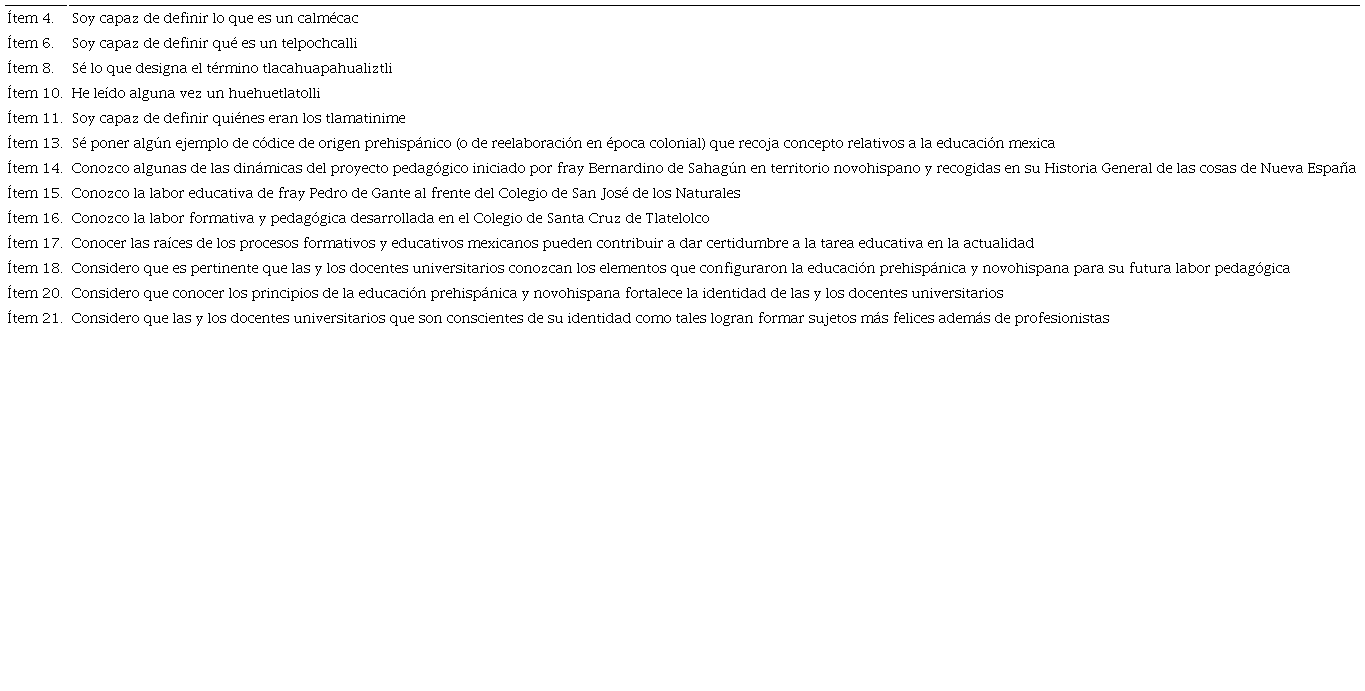 Las variables analizadas se han medido a través de un cuestionario mixto compuesto por 21 ítems, medidos en escala Likert de cinco puntos (1, muy en desacuerdo - 5, totalmente de acuerdo), que se estructuran en cuatro focos de análisis: 1) características sociodemográficas (ítems 1-3); 2) percepción sobre elementos educativos prehispánicos (ítems 4,6,8,10,11); 3) percepción sobre elementos educativos novohispanos (ítems 13-16); y 4) percepción sobre el conocimiento de las raíces educativas y su vinculación con la identidad y la actividad profesional (ítems 17, 18, 20, 21).