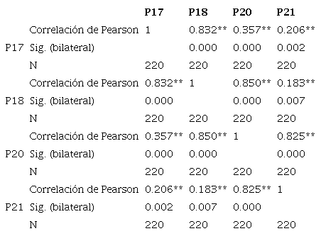 La correlación más elevada y significativa de las cuestiones analizadas la encontramos entre los ítems 18 (Considero que es pertinente que las y los docentes universitarios conozcan los elementos que configuraron la educación prehispánica y novohispana para su futura labor pedagógica) y 20 (Considero que conocer los principios de la educación prehispánica y novohispana fortalece la identidad de las y los docentes universitarios) (r = 0.850). De igual forma, también son significativas las correlaciones entre los ítems 20 y 21 (Considero que las y los docentes universitarios que son conscientes de su identidad como tales logran formar sujetos más felices además de profesionistas) (r = 0.825) y entre los ítems 17 (Conocer las raíces de los procesos formativos y educativos mexicanos pueden contribuir a dar certidumbre a la tarea educativa en la actualidad) y 18 (r = 0.832). Como ya se ha señalado, tales valores son indicativos de correlaciones entre las respuestas emitidas por los participantes (Tabla 5).