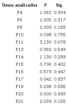 Asimismo, para completar nuestra investigación, hemos asumido varianzas iguales y hemos procedido a hacer un ANOVA de un factor por género de la muestra. Después del análisis realizado, se debe señalar que no existen diferencias significativas entre mujeres y hombres en relación con las respuestas emitidas en todos los ítems (Tabla 6). Por tanto, se rechaza la posibilidad de diferencias significativas en nuestro estudio en cuanto al género.