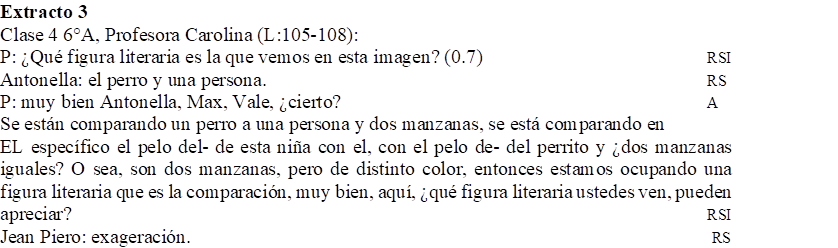 También es frecuente que la interacción RSI-RS vaya acompañada de la aceptación de la respuesta (A) y la elaboración (EL). Esta estructura es muy similar a la interacción IRE-IRF en tanto el feedback o la evaluación se traducen en la elaboración que hace la profesora con base en la respuesta del estudiante y el código de aceptación “A”. Este último código expresa la conformidad de la respuesta esperada explicitado en una afirmación positiva como “muy bien”. También se puede observar que una vez que es elaborada la respuesta por la profesora se inicia una nueva secuencia de RSI como se indica en la penúltima línea del extracto 3:
