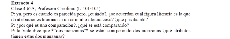La invitación a elaborar (ELI) ocurre cuando se invita a construir sobre una idea previa, evaluar o aclarar la contribución propia o ajena. En la muestra, la invitación a elaboración (ELI) aparece 19 veces, mientras que la frecuencia de la elaboración es de 102. Esta disparidad en la frecuencia indica que las elaboraciones ocurren también en otras invitaciones, especialmente luego del código RSI como ya fue explicado. Por ejemplo, la elaboración ocurre 49 veces luego de un enunciado de acuerdo (A) de un estudiante. En este sentido, la elaboración se utiliza como una estrategia pedagógica para complementar la respuesta del estudiante. Por otro lado, las elaboraciones también contribuyen a clarificar o complementar contenido que entrega la profesora. En cuanto a la distribución por curso, ambas docentes muestran un número similar de invitaciones (6A: 11; 6C: 8). Por otro lado, las características de las invitaciones varían según la profesora. En el caso de Carolina hay 7 invitaciones a elaborar a partir de una respuesta correcta que se ha expresado de manera cerrada por parte de los estudiantes; en esta docente las invitaciones aparecen seguidas de la expresión de acuerdo. Por otro lado, extracto 4, Carolina inicia diálogos a partir de invitaciones a elaborar en el desarrollo del ejercicio:
