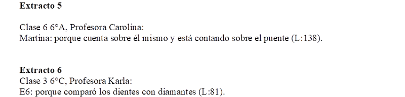 Cabe mencionar que solo en 11 ocasiones las elaboraciones son realizadas por estudiantes, de ellas, 8 ocurren en la clase 4 del 6°A. Esto se condice con que en esta clase se presenta una mayor cantidad de invitaciones a la elaboración (59% del total). Esta clase es la que presenta mayores oportunidades y, como consecuencia, mayores interacciones en este sentido. Esta estrategia es desplegada con mucha mayor frecuencia por la profesora Karla. Cabe mencionar, además, que las elaboraciones aparecen antes en el desarrollo de la clase.