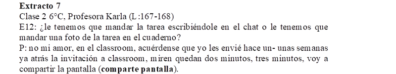[…] hubo que hacerles la introducción gigante porque a ver pasó que llevábamos más de un mes y medio y habían estudiantes que no sabían lo que era el classroom y que no se manejaban a pesar de haber aceptado la invitación o sea no lo, no lo usaban para nada, simplemente yo creo que hacían mucho esfuerzo en seguir las instrucciones que di de un comienzo para buscar el link y conectarse, pero en sí no leían, no comentaban y me lo explicaron, me lo explicaban a veces de forma interna que no sabían lo que era classroom (Karla).