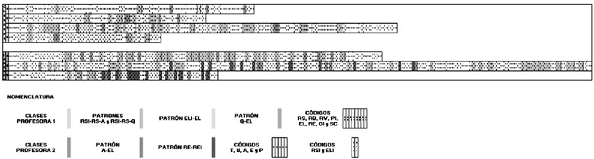 En el apartado anterior se observa que las díadas promotoras del diálogo para el aprendizaje como la elaboración ELI-EL y el razonamiento REI-RE, aparecen de manera moderada en el análisis. Ahora, es interesante observar estas recurrencias a lo largo de las clases, en tanto esto da cuenta de la dimensión temporal del aprendizaje. Como plantea Mercer (2008:35): “dado que el aprendizaje es un proceso que ocurre a lo largo del tiempo, y el aprendizaje está mediado por el lenguaje, tenemos que estudiar el diálogo a lo largo el tiempo para entender cómo el aprendizaje sucede y por qué ocurren ciertos resultados de aprendizaje”. En este sentido, para dar cuenta de las características del diálogo en el aula a lo largo de la clase, se elaboró una propuesta visual de representación temporal de las interacciones orales, el diagrama indica la secuencia de interacciones a partir de su aparición en la realización de la clase y en la progresión de las clases que observamos.