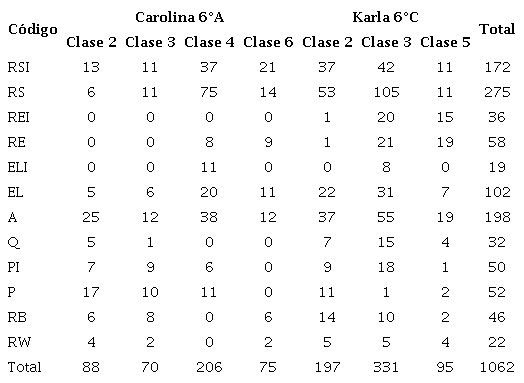 La segmentación de las transcripciones se realizó siguiendo la perspectiva dialógica y el acto comunicativo (CA). Es decir, cada acto comunicativo corresponde a una expresión de un individuo o turno de habla. No se consideraron superposiciones en la codificación, sino que se tomaron de manera separada. Es decir, un turno de habla seguido por el siguiente turno de habla. Para el análisis se incluyeron la frecuencia de códigos y la codificación de cada una de las sesiones seleccionadas, las cuales corresponden a siete clases en total: tres consecutivas de 6ºA y cuatro consecutivas de 6°C. Se realizó un solo nivel de análisis a partir de los turnos de habla.