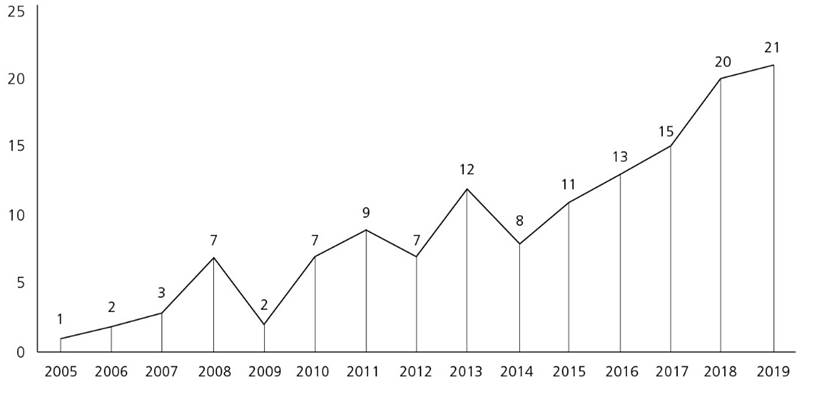 El corpus de lectura final permite graficar la evolución de los artículos por año de publicación. Como se observa en la Figura 1, los 141 textos comienzan en 2005 con una única publicación y van en continuo aumento hasta 2019, cuando se alcanzan 21. El año 2020, que cuenta con tres publicaciones, no ha sido considerado en la figura pues fue un año completamente anómalo producto de la pandemia producida por la COVID-19. Este gráfico ilustra que el campo de estudio de la FID, cuando es cruzado por la categoría cultura, es uno que con el tiempo ha ido produciendo un mayor número de trabajos.