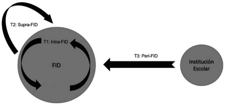 Así, estas tres temáticas permiten generar un mapa renovado del campo de estudio la FID (Figura 2). Como lo muestra la figura, primero, destaca una mirada intra-FID (tema 1), dando cuenta de que la noción de cultura posibilita este abordaje general respecto de lo que sucede en el interior de las instituciones formadoras de docentes. Este primer foco es donde se concentra el trabajo más reflexivo, histórico y teórico sobre la cultura FID. Junto con ello, un segundo foco posee un carácter supra-FID (tema 2), en el sentido de ofrecer una mirada sobre la formación considerando la perspectiva de diversos actores, en particular el estudiantado de Pedagogía como principal sujeto que experimenta un proceso formativo en su tránsito por la FID. Aquí, una determinada cultura FID está intentando ejercer una fuerza formativa sobre las y los futuros docentes. Finalmente, una última mirada de este campo posee un carácter peri-FID, en el sentido de que esta mirada sucede en la escuela, el espacio más cercano a la formación y que da cuenta de una transición hacia la inserción laboral. Particularmente se interroga por la visión que tiene el profesorado novel sobre la FID y su pertinencia frente a lo que se necesita “saber” para ejercer ese oficio en las escuelas (tema 3). Aquí existe una mirada empírica cuya intención es comparar el choque entre dos culturas: la cultura FID y la cultura escolar.