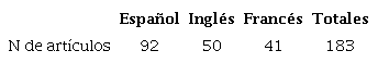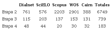 Etapa 4. Incluidos: se produjo la elección final del corpus preliminar para la revisión de la literatura. De un total de 6,749 trabajos, se seleccionaron 183, los que se resumen en la Tabla 1. Además, la Tabla 2 muestra el total general de la revisión, según los idiomas de la muestra final obtenida para este trabajo.