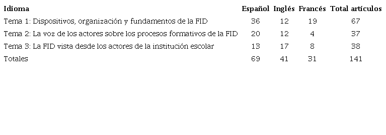 Tema 3: La FID vista desde los actores de la institución escolar. El tercer tema, correspondiente al 26.9% del total de textos, refiere a artículos que sitúan su trabajo empírico en la escuela. Desde este espacio, se interroga generalmente al profesorado novel sobre su percepción de la FID u otras dimensiones centrales del quehacer docente que son reflexionadas a la luz de su formación, como el uso de tecnologías de la información y la comunicación (TIC) o la participación en comunidades de aprendizaje. En algunos trabajos, son los investigadores quienes, sobre la base de estudios empíricos, identifican elementos de mejora de la formación.