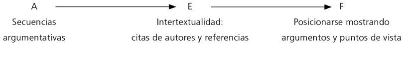 De la Figura 5 se concluye que en el enfoque cognitivo de la escritura, con énfasis en su carácter procesual y en las operaciones cognitivo-discursivas activadas por doctorandos durante la revisión colaborativa del planteamiento del problema de investigación de tesis, los estudiantes no consideran relevante la incidencia de las secuencias argumentativas con respecto a posicionarse mostrando argumentos y puntos de vista. Sin embargo, hemos determinado que, en el discurso, la construcción de secuencias argumentativas tiene una alta incidencia en la intertextualidad: citas de autores y referencias y estas, a su vez, inciden en el buen posicionamiento, mostrando argumentos y puntos de vista.