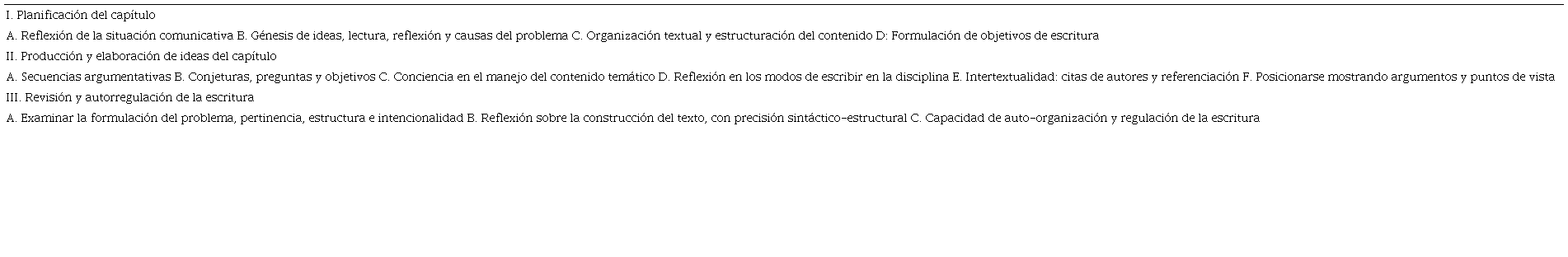 La Tabla 1 presenta los descriptores clasificados en tres grandes bloques referentes a los procesos de a) planificación del capítulo, b) producción y elaboración de ideas y c) revisión y autorregulación de la escritura.