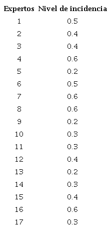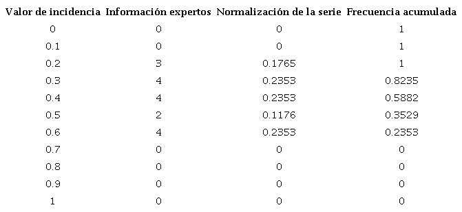 Con base en las valuaciones de los expertos, se procedió a aplicar expertizaje y contraexpertizaje (Kaufmann y Gil Aluja, 1990) para obtener las funciones de distribución acumulativas, presentadas en la Tabla 3, y proceder a hacer caer la entropía. La aplicación de expertizaje y contraexpertizaje permite relacionar la opinión de los expertos, tal como se evidencia en la Tabla 3, donde los 17 académicos que participaron emitieron su opinión con base en la escala semántica endecadaria mostrada en la Tabla 2 y, de este modo, expresar la incidencia de los distintos descriptores como relación causa/efecto. Los cálculos se muestran a continuación con sus respectivos pasos.