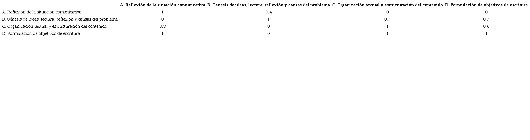 La Figura 2 muestra que en el enfoque cognitivo de la escritura, con énfasis en su carácter procesual y en las operaciones cognitivo-discursivas activadas por los doctorandos durante la revisión colaborativa del planteamiento del problema de investigación de tesis, los estudiantes no consideran de relevancia la incidencia de la génesis de ideas, lectura, reflexión y determinación de las causas que originan el problema en el proceso de reflexión de la situación comunicativa en la que se desarrolla la escritura de la tesis. Sin embargo, hemos determinado que dicha incidencia tiene, a su vez, una alta incidencia en la formulación de objetivos de escritura y estas, a su vez, inciden en una buena reflexión de la situación comunicativa. Para una buena reflexión de la situación comunicativa, el estudiante debe hacer énfasis en la formulación de los objetivos de la escritura y eso se logra con un manejo correcto de la génesis de ideas, lectura, reflexión y causas del problema.