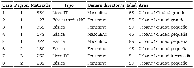 En este trabajo participaron directoras y directores que fueron nombrados en sus cargos durante 2019 o a inicios de 2020. Se seleccionaron ocho casos con estas características, todos de escuelas públicas, categorizadas por el sistema educativo chileno como “insuficientes” (ACE, 2018), de tres regiones del país. Las y los participantes se desempeñan en instituciones que imparten diferentes niveles y modalidades de enseñanza. La Tabla 1 presenta sus características generales.