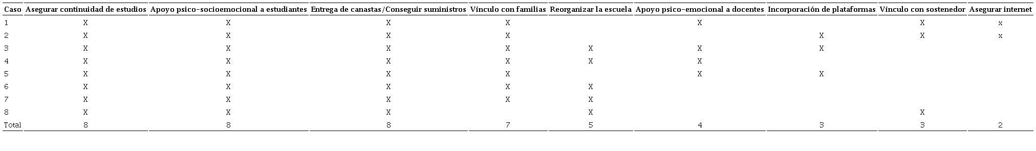 La Tabla 2 describe los contenidos de los planes que siguieron las y los nuevos directores y sus equipos directivos para enfrentar la etapa marcada por la emergencia sanitaria. Se observa que hay tres acciones que se incluyeron en todos los planes y que relevan un énfasis transversal para enfrentar el primer año de pandemia: a) la entrega de apoyo socioemocional a estudiantes, b) la búsqueda de aseguramiento de la continuidad de estudios y c) la entrega de canastas con alimentos para las familias. Asimismo, casi en la totalidad de los casos (salvo uno), se consideró establecer contacto con las familias para informar y apoyar a las y los apoderados en el aprendizaje del estudiantado. Como puede observarse, este último componente del plan es el único que tiene un perfil claramente relacionado con los procesos de enseñanza y aprendizaje. Finalmente, un conjunto de casos buscó realizar transformaciones en la organización general de la institución, considerando roles, responsabilidades y tareas a realizar durante el periodo.