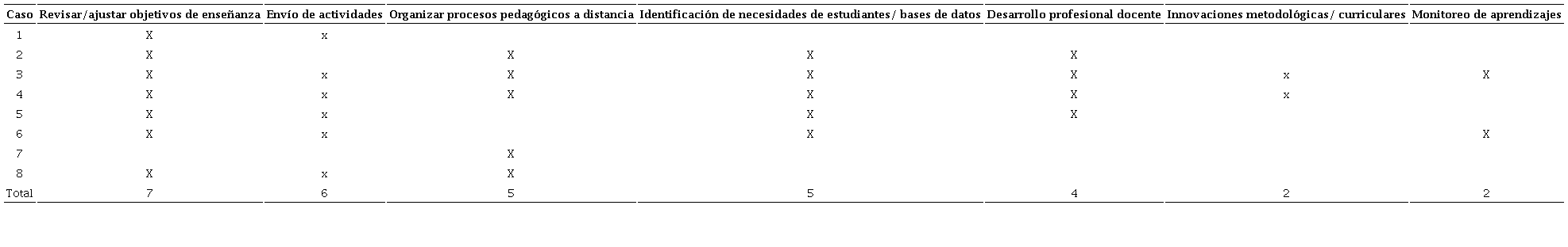 Del total de ocho establecimientos, un subconjunto de directoras(es) y sus equipos avanzó en el desarrollo de un plan más claramente pedagógico, en el que se buscó vincular el enfrentamiento de la pandemia con otras necesidades de mejora educativa. Este ejercicio incluyó la revisión y/o ajuste de los objetivos de aprendizaje que se trabajarían en el año, la dedicación de esfuerzos al desarrollo de una metodología para la enseñanza a distancia, acompañada de la generación y sistematización de información sobre el estudiantado y la gestión de procesos de desarrollo profesional. Dentro de esto último, en algunos casos se consideró formación relacionada con aspectos específicos de uso de tecnologías, mientras que otros incluyeron oportunidades para propiciar mejoras en habilidades más permanentes, como es la retroalimentación de aprendizajes evaluados. Dentro de este subgrupo, dos directores incluyeron también sistemas de evaluación de los aprendizajes efectivamente alcanzados en el contexto de pandemia. El resto de los casos de estudio solo alcanzó a hacer un seguimiento de la entrega y retorno de las actividades de aprendizaje enviadas por el profesorado a las y los estudiantes (Tabla 3).