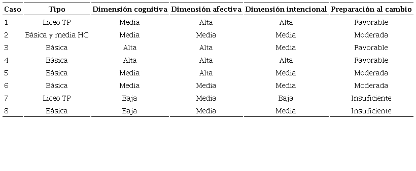 Al tratar de comprender estos dos aspectos desde una perspectiva de la preparación para el cambio y las acciones realizadas, hemos podido distinguir tres grupos. El primero, con mayor preparación para el cambio, aparece con una actitud positiva en los aspectos tanto cognitivos como afectivos y la intencionalidad hacia el cambio. El grupo con una preparación intermedia hacia el cambio aparece con actitudes positivas y negativas en estos tres aspectos. Finalmente, el grupo con una preparación más negativa o insuficiente muestra una mayor resistencia asociada al cambio de las creencias previamente establecidas, como una resistencia negativa tanto en sus aspectos afectivos como en aquellos asociados a la intencionalidad.