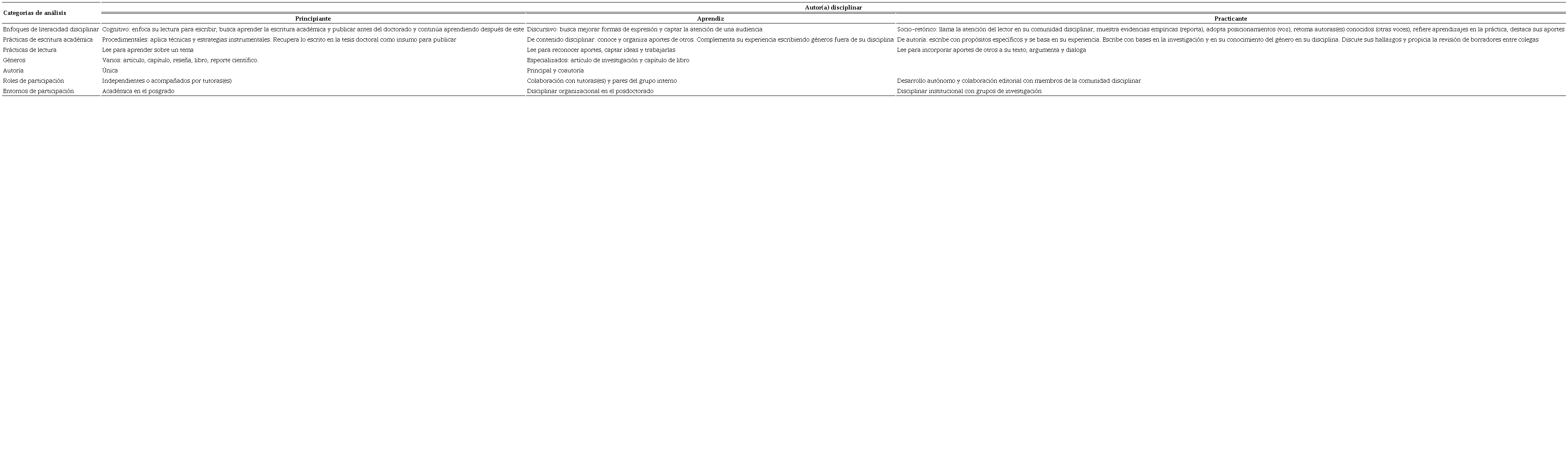 Una de las contribuciones más importantes de este artículo es el análisis de las prácticas y desarrollos de literacidad disciplinar después del doctorado. Estudiar las prácticas y los entornos de publicación a través de las experiencias de quienes inician una carrera en la investigación independiente, dejando atrás el programa institucional en que se formaron, nos permitió reconocer tres momentos de la trayectoria de cada investigador(a) como autor(a) disciplinar: principiante, aprendiz y practicante (ver la Tabla 1). Adoptamos tales categorías para mostrar el progreso de aprendiz-dependiente hacia la autoría independiente del(la) practicante. Asimismo, incluimos categorías relacionadas con roles de participación y autoría (Carrasco et al, 2020) que implican compromisos asumidos por quien investiga en su búsqueda de asegurar la publicación y posiblemente, suponemos, para crecer como practicante en la vía de ir consolidando una línea de investigación.