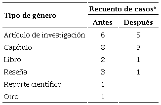 Cabe aclarar que todas(o) informaron haber publicado el género artículo de investigación en algún momento de su trayectoria, excepto tres: una de ellas, economista, sin publicaciones al momento de la entrevista, y dos investigadores del área educativa que tenían experiencia, uno publicando solo capítulos de libro (seis productos) y la otra un libro. Dos sociólogas informaron que también habían publicado los géneros capítulo y reseña. Otra investigadora educativa también informó haber publicado capítulo y reporte científico.